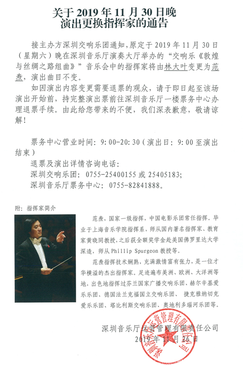 本场音乐会由深圳交响乐团进行演奏。 深圳交响乐团成立于1982年,沐浴着改革开放的春风,经过30多年不懈努力和奋斗,确立了中国最优秀职业交响乐团的地位,跻身国际乐坛并占有了一席之位。现任团长是国家一级演奏员、小提琴家聂冰,艺术顾问是著名指挥家余隆先生,音乐总监是杰出青年指挥家林大叶。