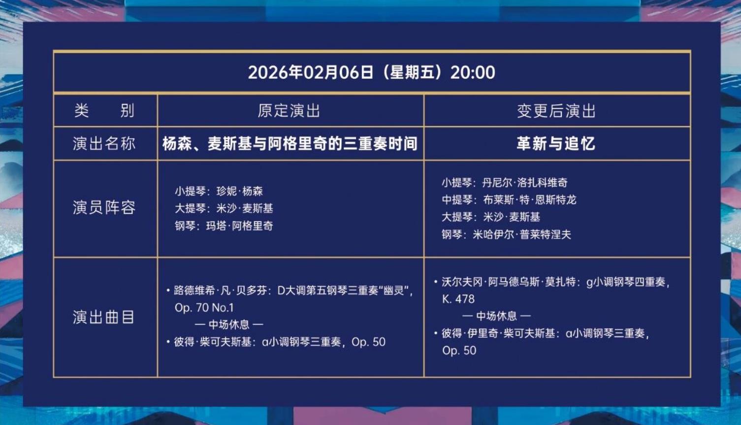 ①原钢琴家玛塔·阿格里奇变更为钢琴家米哈伊尔·普莱特涅夫、原小提琴家珍妮·杨森变更为小提琴家丹尼尔·洛扎科维奇