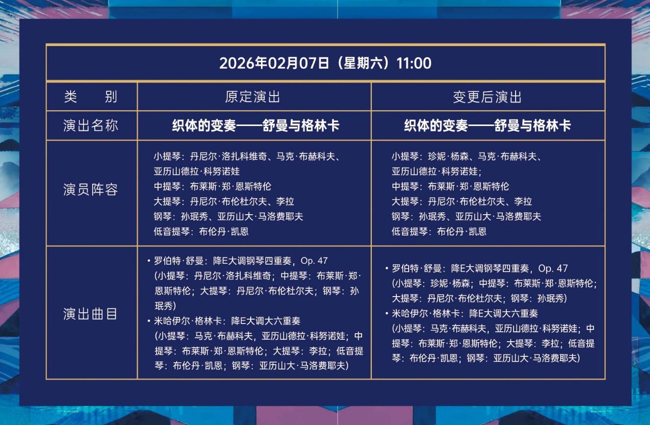 本次变更的五场演出,如因艺术家或演出曲目变更需要退票的观众(仅限2026年1月17日13:00前购票),请于即日起至2026年1月20日13:00前,通过原购票渠道办理退票手续。无需退票的观众,请持原门票于演出当天前来观演。