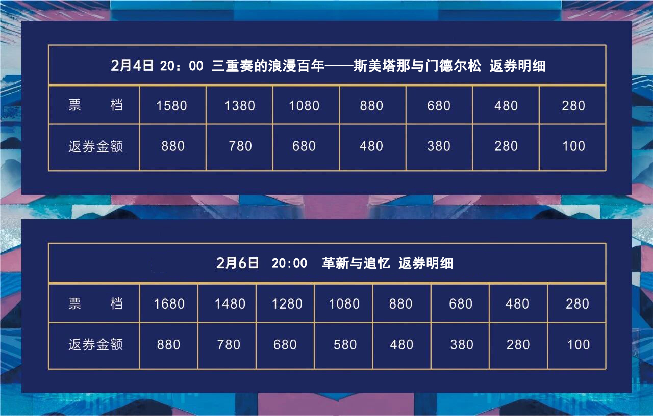 温馨提示:购买2月4日“三重奏的浪漫百年——斯美塔那与门德尔松”或2月6日“革新与追忆”任意一场演出,可获得上述对应票档及张数的消费券,消费券到账时间为购票后次日中午12:00前,具体返券金额请查看上述明细。