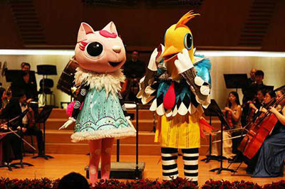 “哆唻咪”、“大灰鸡”,是两只人偶的名字。哆唻咪是热爱音乐的小猫咪,大灰鸡是来自热带海岛热情洋溢的大公鸡。在它们生动故事的引导下,乐团演奏的曲目更加形象化,拟人化,小朋友们更容易接受,听懂。因此,它们也肩负起带领小朋友们聆听音乐,走进音乐,爱上音乐的使命。