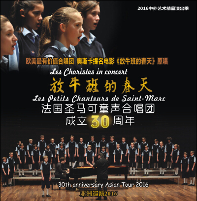 自《放牛班的春天》上映以来,世界范围内的“放牛热”就没有间断过:圣马可童声合唱团巡演走遍西班牙、美国、日本、中国等二十多个国家,演唱曲目从最初的赞诗歌到世界著名的电影插曲,再扩大到后来的当地名曲……而今年,圣马可将把过去那些曾经感动过我们的歌曲重新呈现在我们面前:如耳熟能详的《放牛班的春天》里的歌曲“眺望你的路途”、“抚摸海洋”,把观众们再次回忆电影里的感动之处;经典的赞美歌“天使食粮”、“圣母玛利亚”,这些赞美歌将带领观众们重温圣马可的“天籁”;其后合唱团还向多部音乐剧致敬,《雨中曲》里的“雨中歌唱”以及《欢乐满人间》的“妙不可言”,让观众再次领略到音乐剧的精髓,感受不同音乐剧的魅力!
