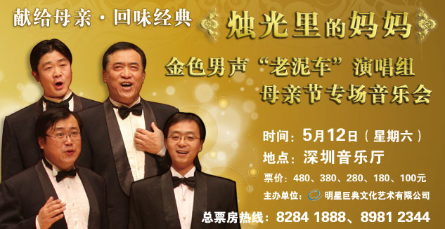 5月12日,金色男声“老泥车”演唱组与您再次相约深圳音乐厅,演绎《烛光里的妈妈》、《达坂城的姑娘》、《彩云追月》、《莫斯科郊外的晚上》等老中青观众都耳熟能详的经典歌曲,并携手两位特邀嘉宾青年女高音歌唱家阿金达娃、张爱,为广大母亲献上一份金色的母亲节厚礼。