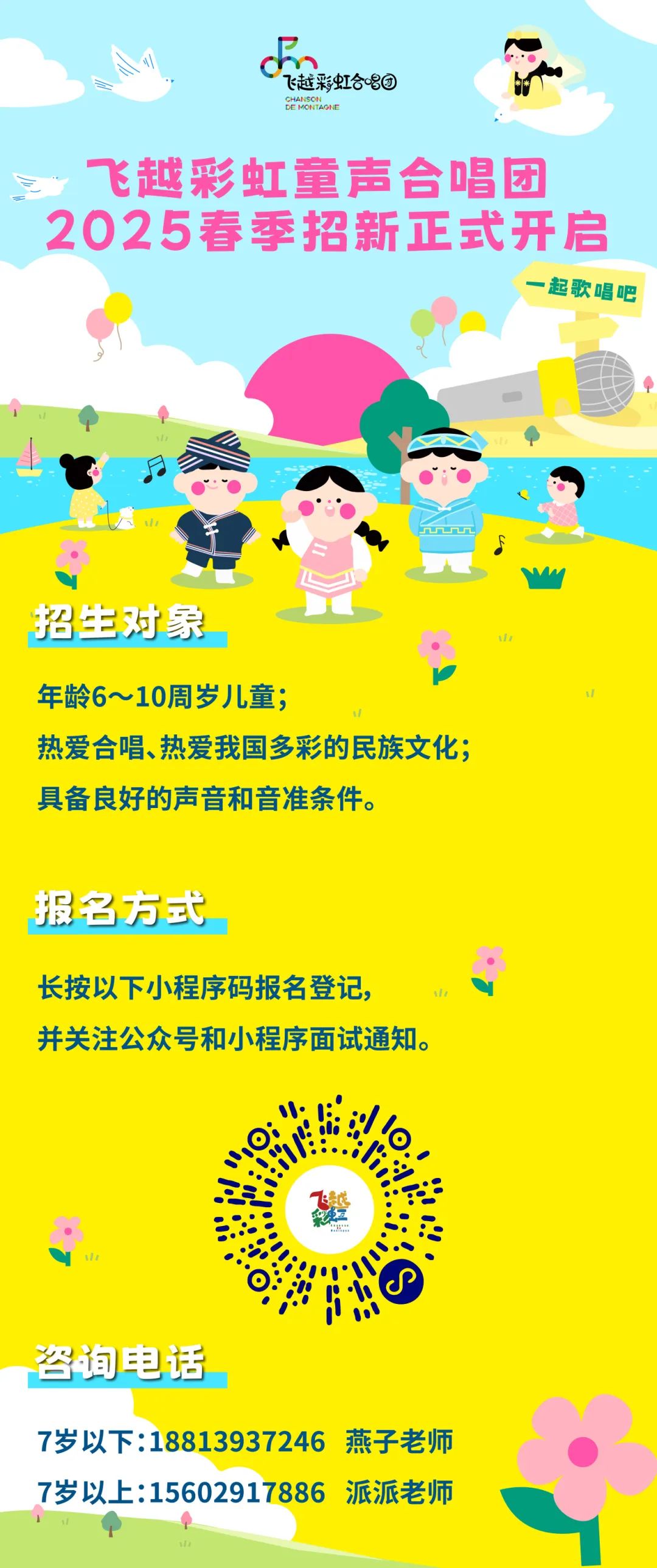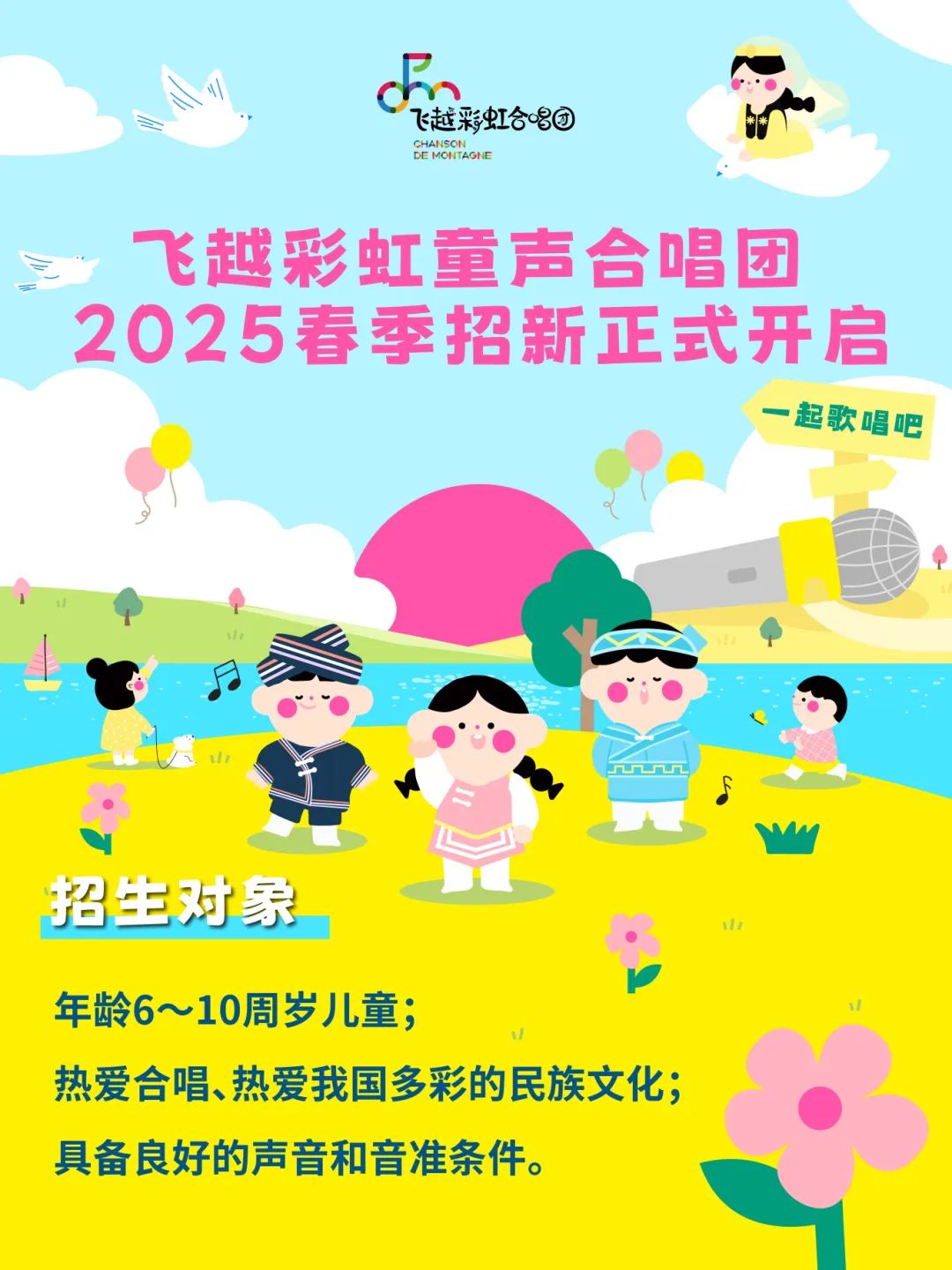 正是在这样的荣誉与肯定中,飞越彩虹合唱团2025年春季招新正式开启啦!我们诚邀所有热爱音乐、热爱合唱、热爱我国多彩的民族文化的小朋友们,加入到飞越彩虹大家庭!