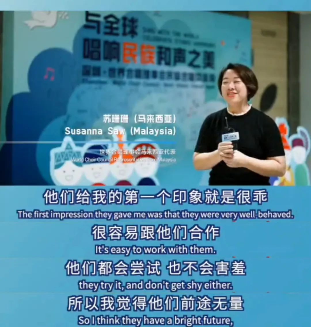 在合唱届的又一盛事,“与全球,唱响民族和声之美”深圳·世界合唱理事会民族合唱交流周上,来自拉脱维亚、希腊、匈牙利、马来西亚多位外籍音乐专家,对飞越彩虹合唱团给予了高度评价。他们表示,飞越彩虹合唱团以其卓越的表演、精湛的技巧和深厚的文化底蕴,成为了多民族童声合唱领域的佼佼者。