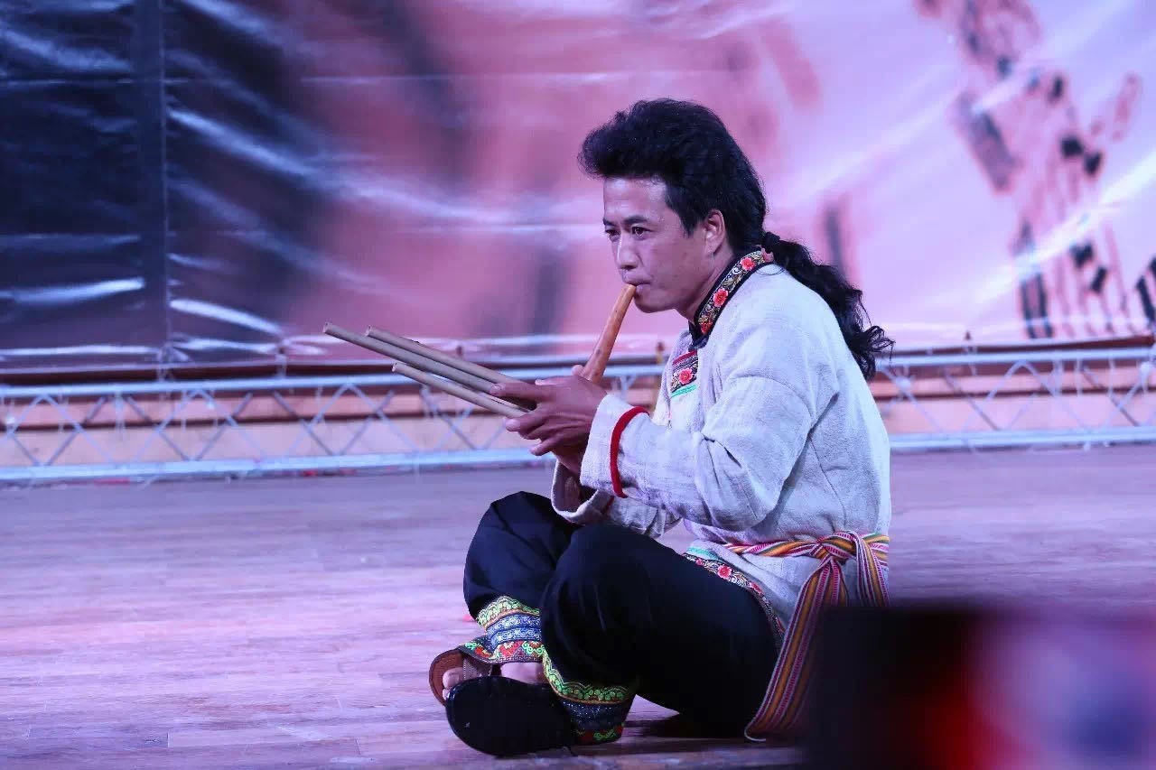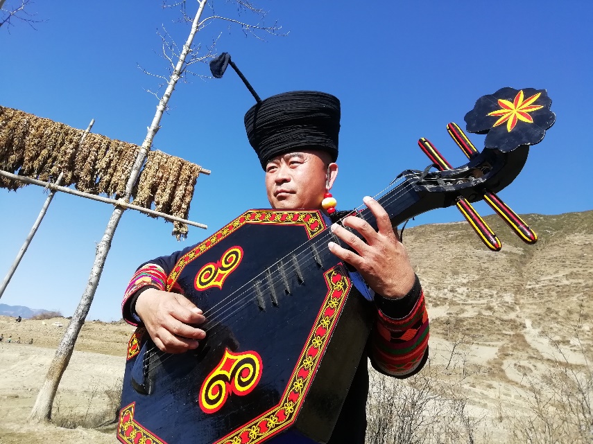Yi minority, A-tie Shuori has studied folk music instruments of Yi ethnic group such as Yueqin, Kexiju’er, Kouxian, Mabu, Muye, as well as traditional folksongs and Kezhi (a type of poetry of Yi’s oral literature) since childhood. After years of practical learning, he has mastered diversified performing techniques of Yueqin playing such as string flipping, picking, strumming, bending, plucking, shifting, and fingers rotating. He has developed his own unique style in performance and joined modern bands. He is a famous Yueqin player. He can also sing more than 300 traditional folksongs of Meigu County and multiple modern popular songs. The high-pitched tune of Yi is one of his personal characteristics.