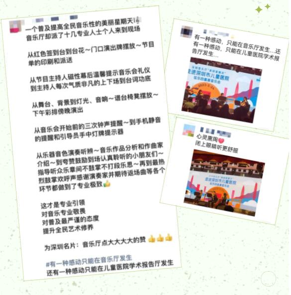金主任表示:“音乐充满了抚慰人心的力量,都说有一种感动只能在音乐厅发生,而如今这种感动在我们儿童医院发生……感谢深圳音乐厅带来的这场高质量的公益演出,让深儿医人走进高雅艺术殿堂,在这个美好的夜晚聆听、品味、感悟音乐之美。”