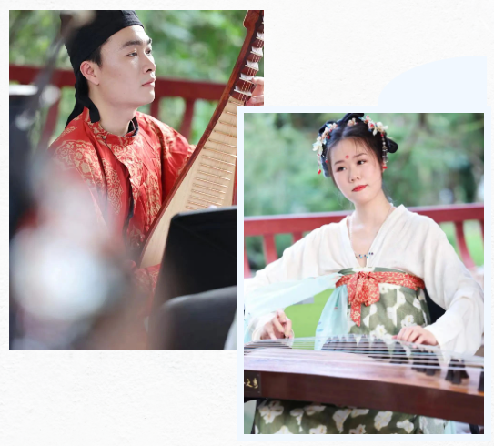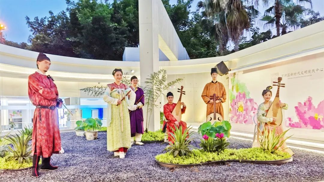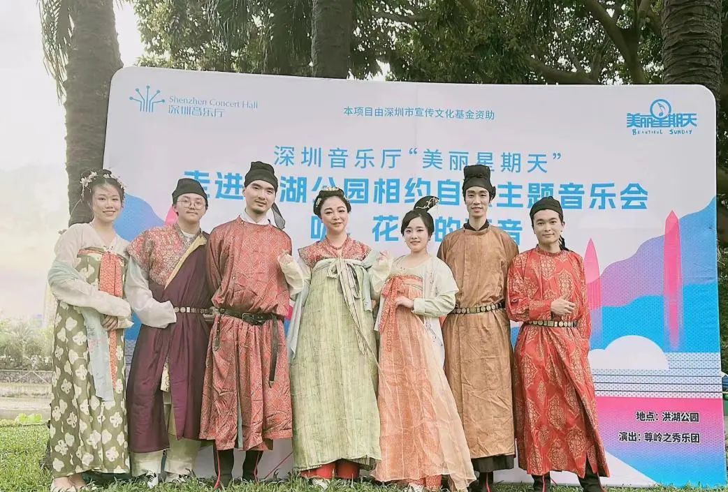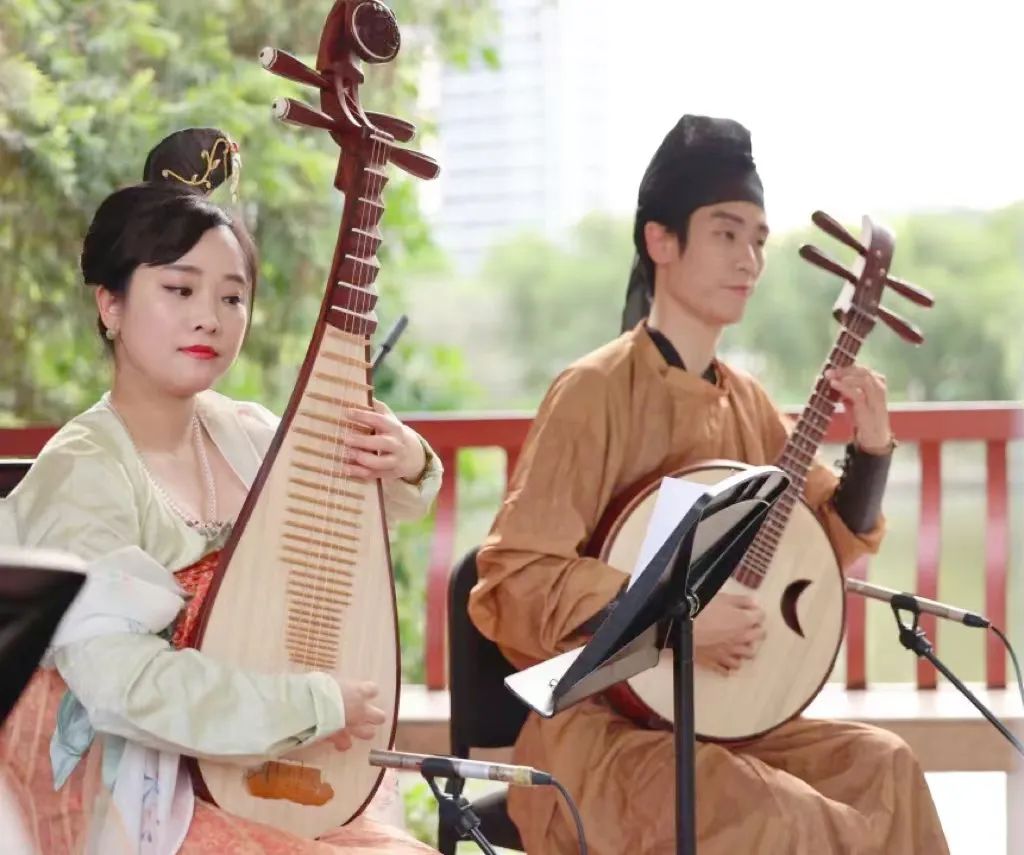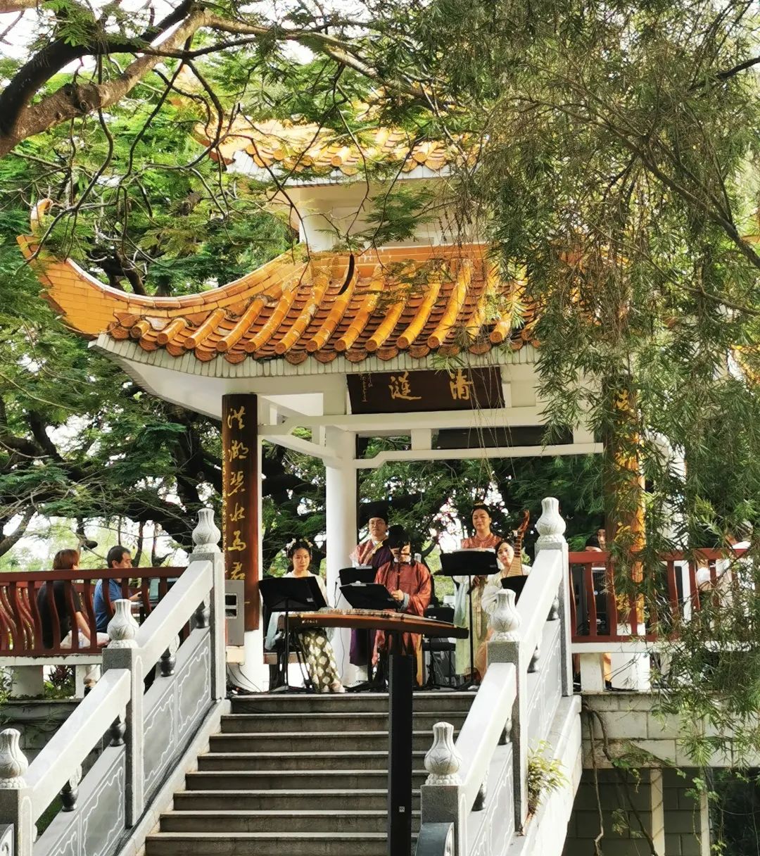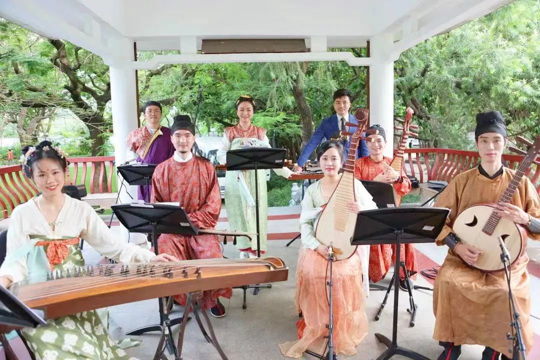 伴随着轻快独特、耳熟能详的旋律响起,一曲新派岭南音乐《彩云追月》拉开了音乐会的帷幕,演奏家们身着全套唐制汉服惊艳亮相。