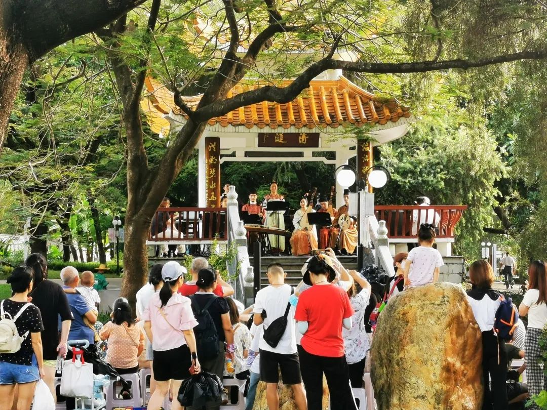 音乐会以“听,花开的声音”为主题,因此也特别挑选了数首与“花”相关的曲目:《桃花醉》《送我一支玫瑰花》《睡莲》……其中,最为应景的莫过于《荷塘月色》,湖心凉亭中奏响的袅袅的乐音映衬着满池盛放的荷花,韵味悠长的国乐与洪湖公园的自然美景两相辉映,不少前来赏荷观景的游客都不禁驻足聆听,沉醉其中。