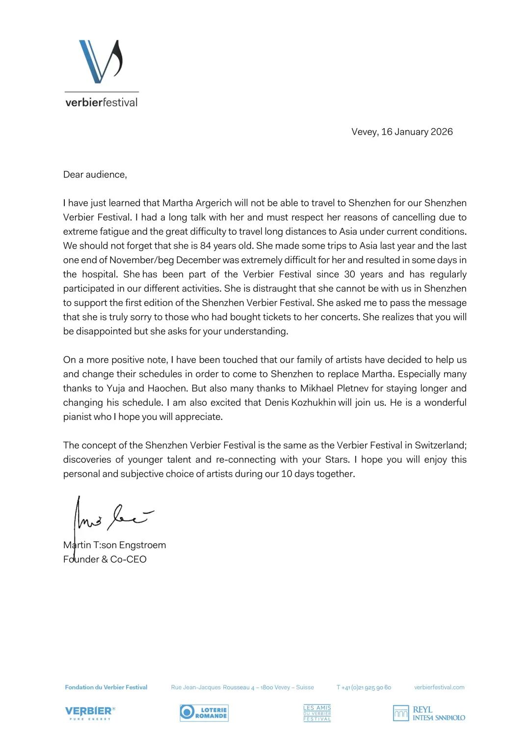近三十年来,玛塔·阿格里奇是韦尔比耶音乐节的核心成员,始终常年参与我们的各类演出与活动。对于本次未能亲临深圳,为首届“韦尔比耶音乐节2026深圳”站台助力,她深感遗憾与自责,并特意委托我,向所有已购买其音乐会门票的观众转达最诚挚的歉意。她深知此次变化会让大家深感失望,也恳请各位观众能够给予理解与包容。