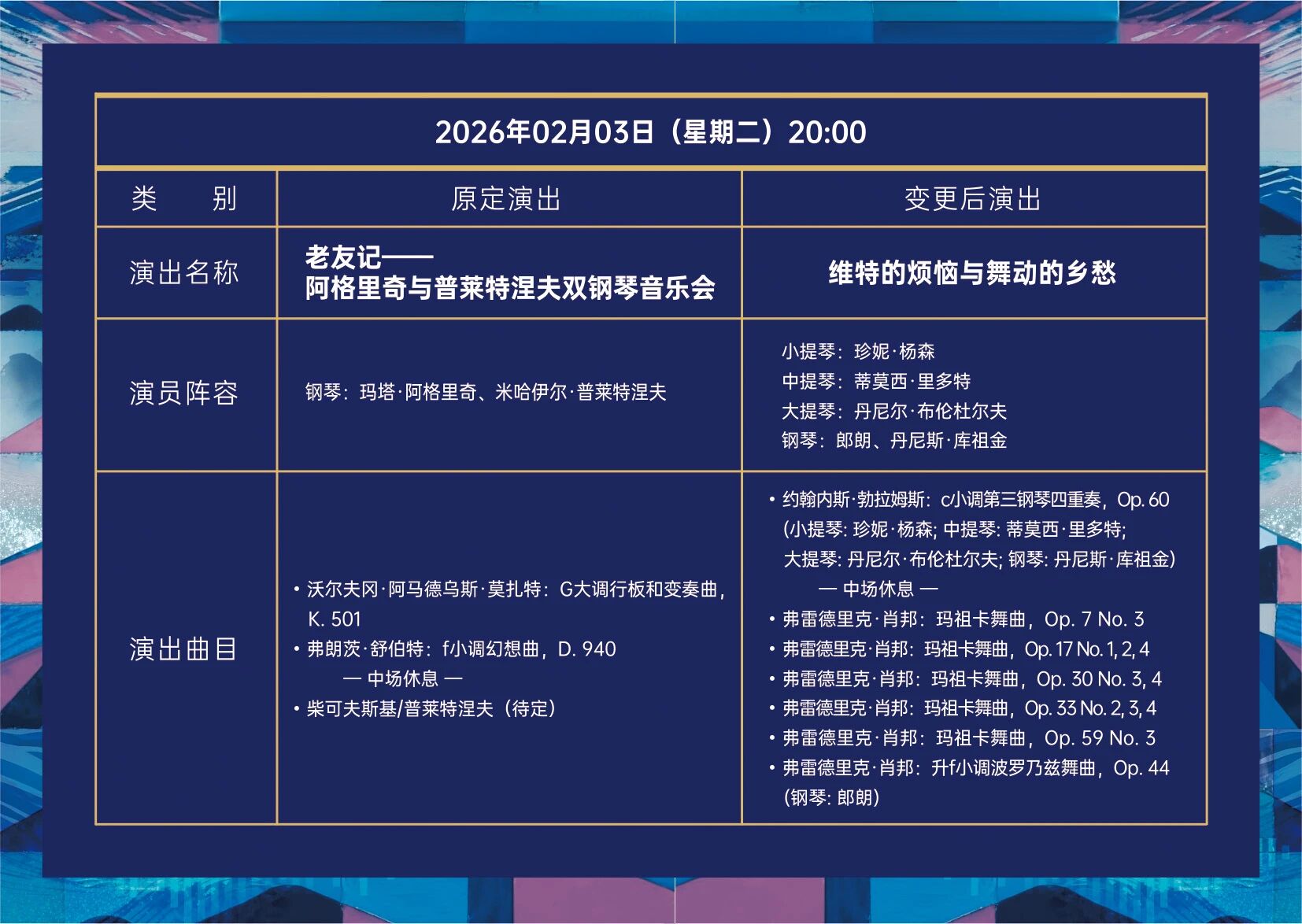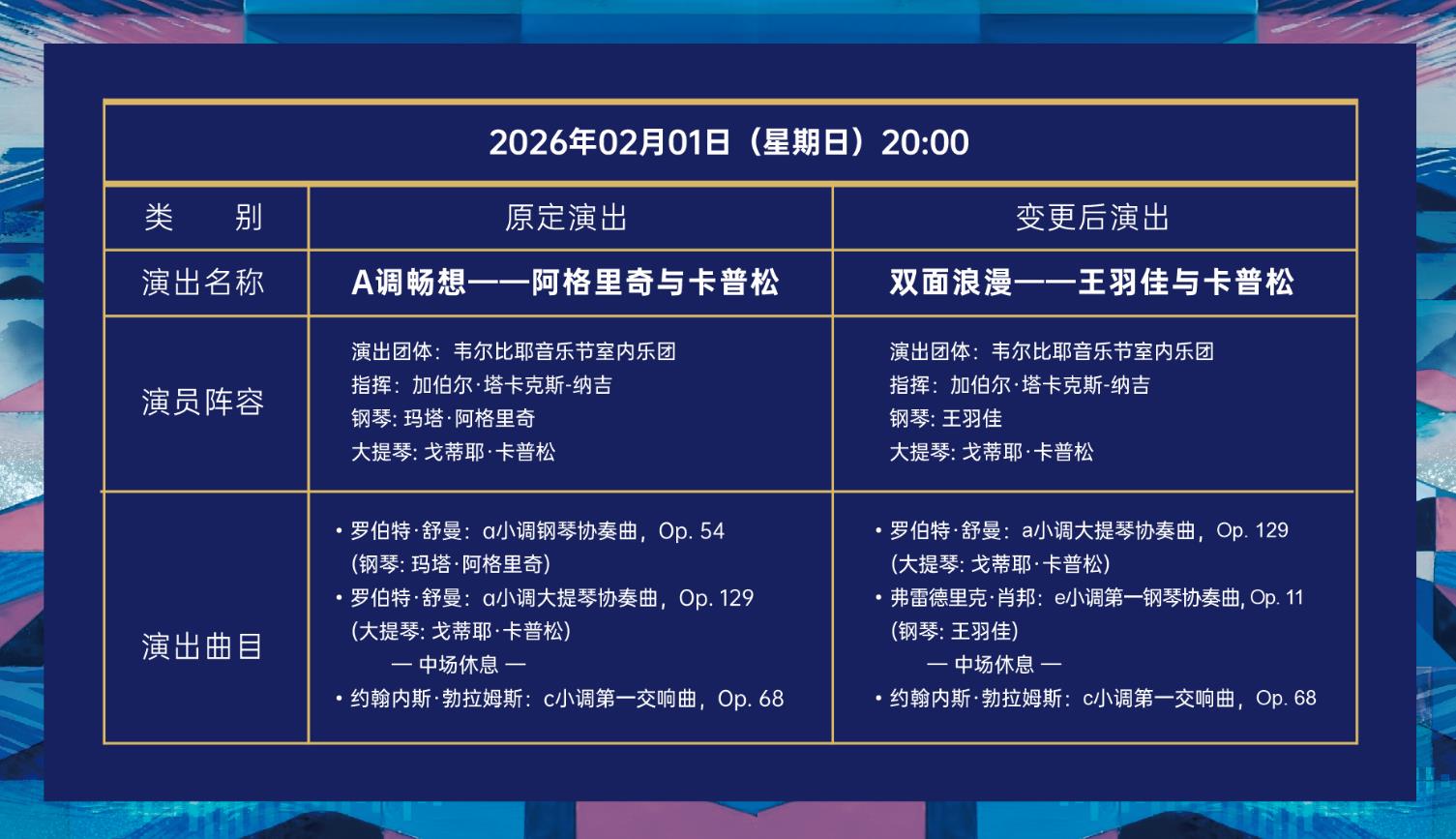 ①原钢琴家玛塔·阿格里奇变更为钢琴家米哈伊尔·普莱特涅夫、原小提琴家珍妮·杨森变更为小提琴家丹尼尔·洛扎科维奇
