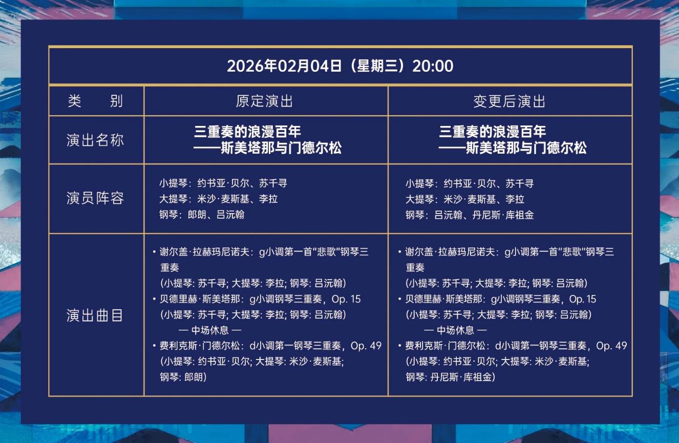 本次变更的五场演出,如因艺术家或演出曲目变更需要退票的观众(仅限2026年1月17日13:00前购票),请于即日起至2026年1月20日13:00前,通过原购票渠道办理退票手续。无需退票的观众,请持原门票于演出当天前来观演。