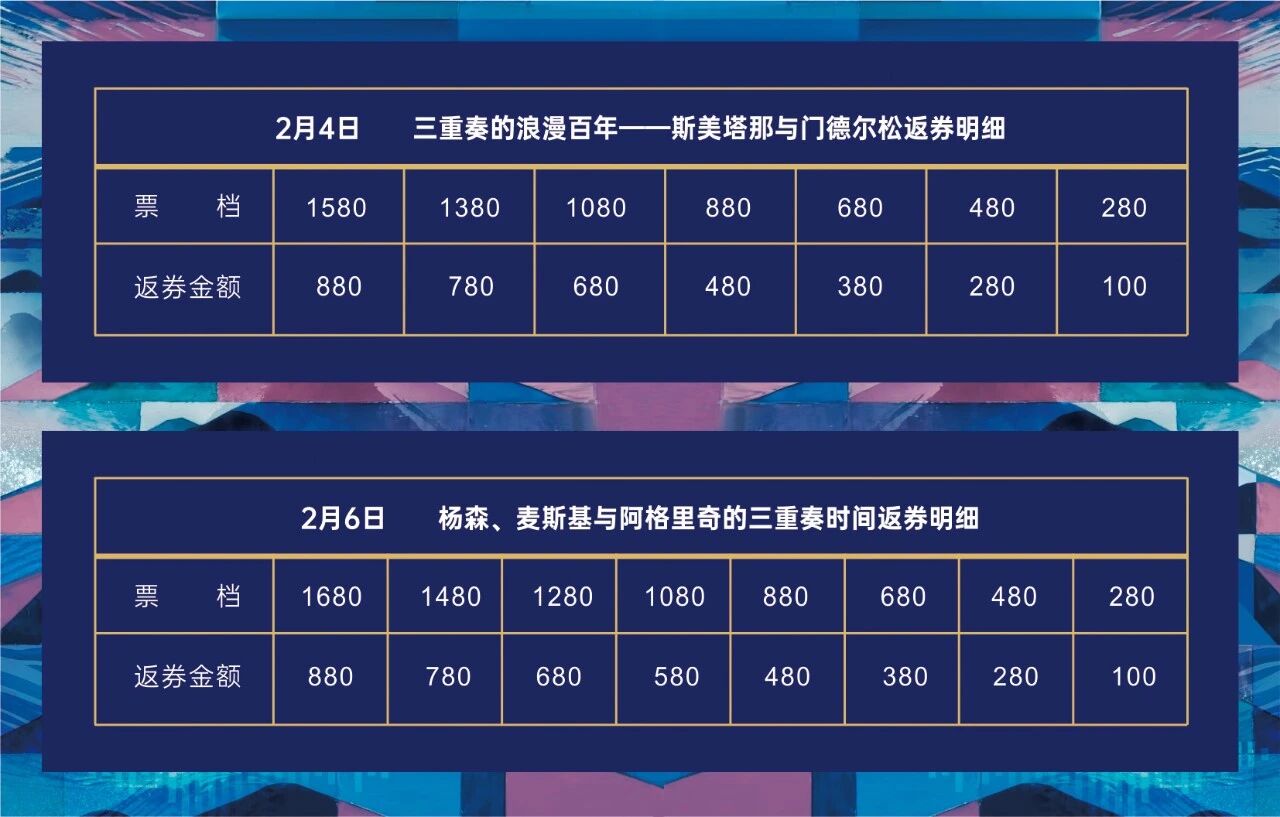 注:2026年1月17日13:00后购买2月4日“三重奏的浪漫百年——斯美塔那与门德尔松”或2月6日“革新与追忆”任意一场演出,同样可获得上述对应票档及张数的消费券,消费券到账时间为购票后次日中午12:00前,具体返券金额请查看上述明细。