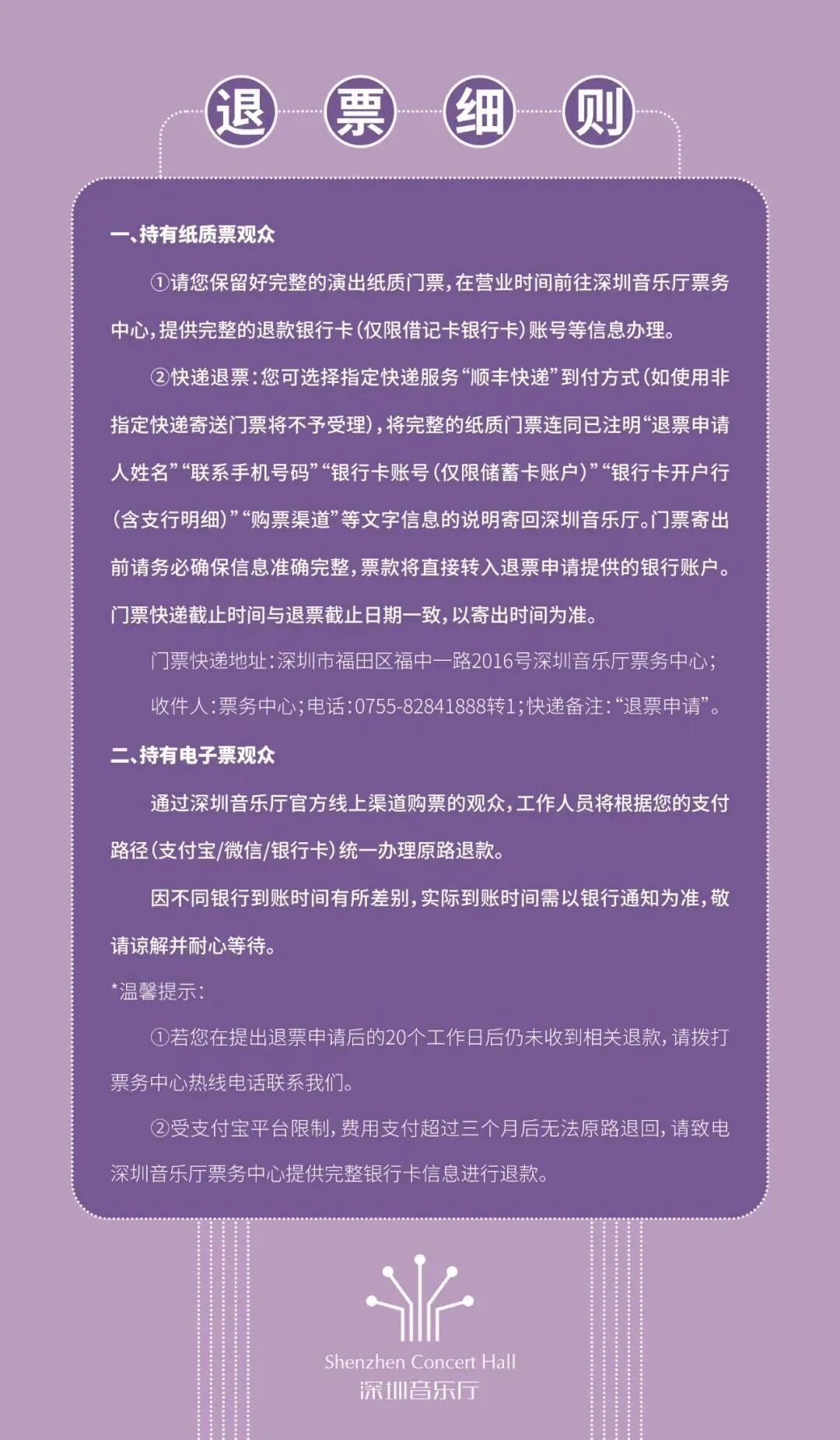 (一)通过深圳音乐厅官方网站及微信小程序购票的观众,请根据《退票细则》办理相应退票手续。