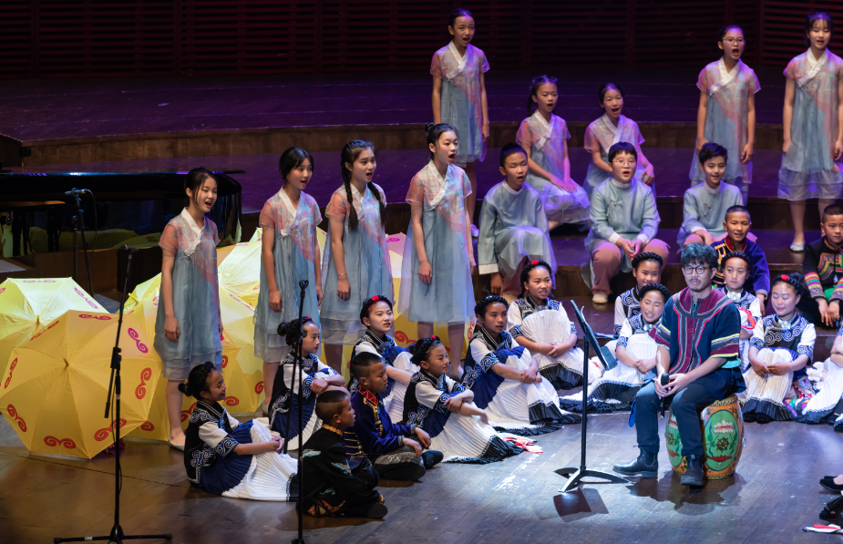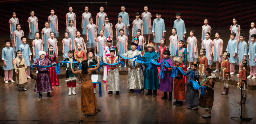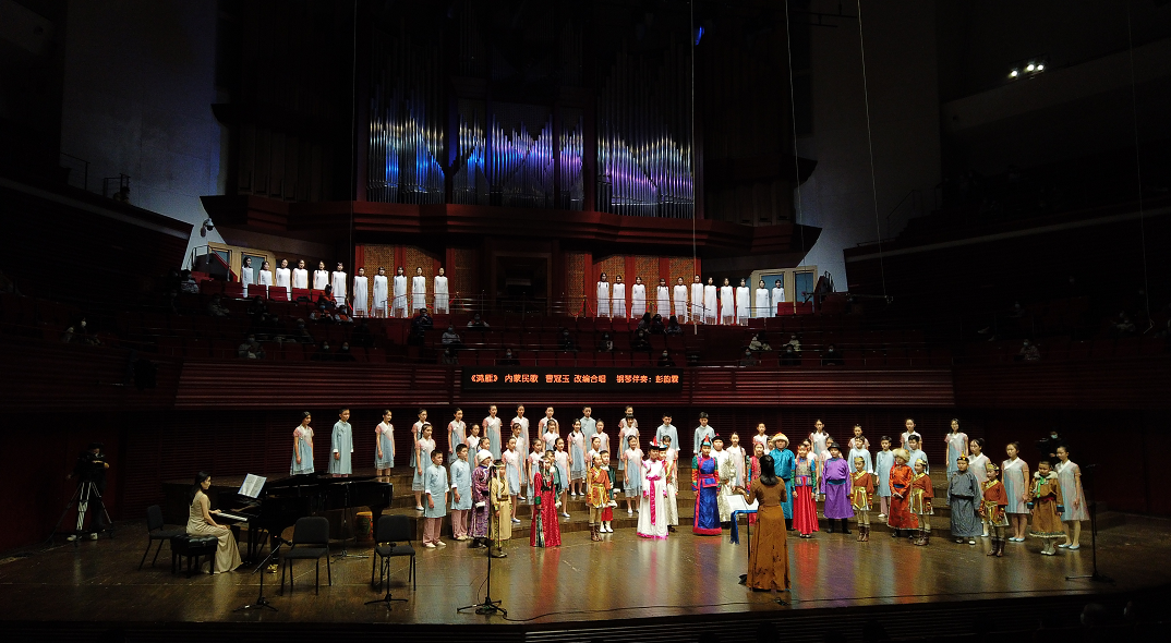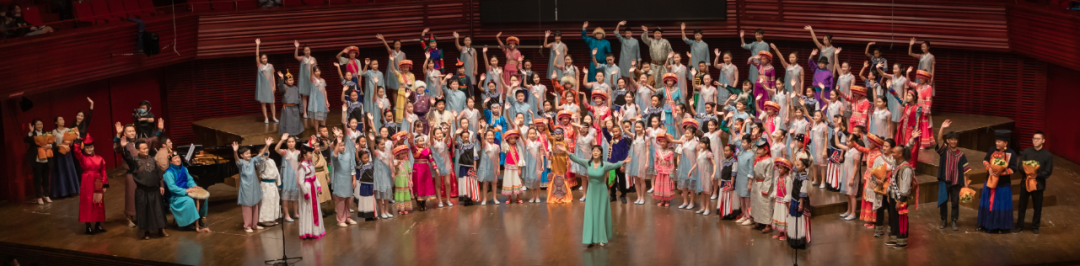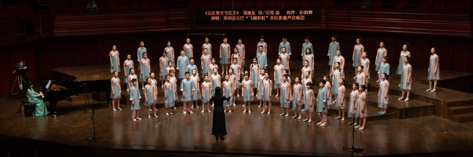 蒙古族的《鸿雁》是两个团一起的合唱,蒙古族和深圳音乐厅“飞越彩虹”多民族童声合唱团的孩子们,同时站在舞台上,轻轻哼鸣,好像模仿那天上飘来的云。不一会儿,鸿雁就要飞来了。我们坐在台下等待,这些空灵的哼鸣,把我们带到云端,一睹鸿雁的英姿。