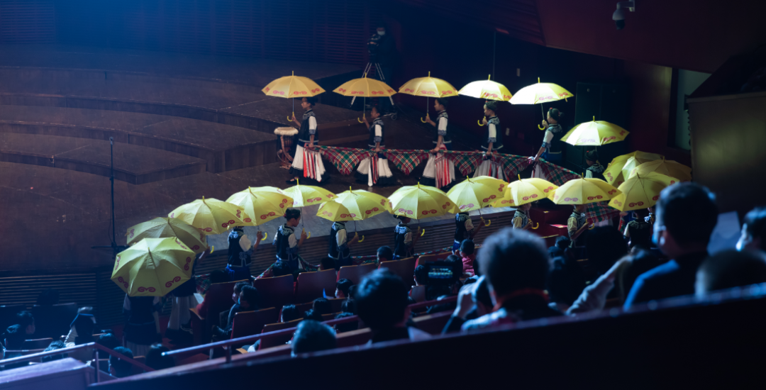 《哒啦哦》是伴随着黄色雨伞的出现,在观众席中间唱出来的。彝族的孩子们,手握着黄色雨伞,一步一步走在观众席台阶上,排成一条队伍,时而弯曲,时而折叠。小步伐迈着,很快的,黄色覆盖了舞台。三道弯,哗啦呼啦地弯弯绕绕着,组成多变的火。彝族是崇尚火的民族,火红色、正黄色和黑色就是他们的幸运色。当正黄色伞上,绣着红祥云,眼看着舞台灯光,从高高的音乐厅顶上照射下来,而这些灯光很长、很细,落在每顶雨伞上,为这个庄重的时刻加冕。就像我们在2020年盛夏,从失去的悲痛中醒来,懂得了如何敬畏自然与大地那样,彝族娃娃们纯天然的歌声使得全场鼓掌欢呼。