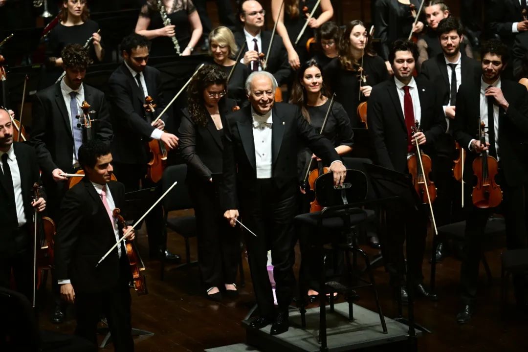 他看上去比18年前率以色列爱乐乐团来深演出时苍老许多,白发稀疏,步履蹒跚。彩排时坐着轮椅上场。全程坐着指挥,毕竟年近九旬。但身着黑色燕尾服的大师精神很好,声音洪亮,笑容可掬,气场强大,拒绝搀扶。他的指挥动作依然干净简捷,且全部背谱指挥,掌控庞大的乐队,四两拨千斤。自阿巴多、海丁克、小泽征尔等相继离世,这一代指挥大师尚剩几何?所以我相信很多乐迷和我一样,是带着一种感恩和珍惜的心情来听他的音乐会的,包括我见到的两位专程从长沙赶来的大学生。