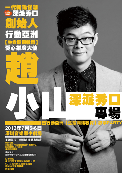 “深圳制造,深派搞笑”最具深圳本土特色的娱乐新势力“深派秀口”爆笑来袭,2013年7月5日、6日深圳音乐厅小剧场,新锐怪咖--赵小山携鬼马团队,为深圳市民带来前所未有的本土娱乐文化新解读。“2013赵小山深派秀口专场”您不容错过的一场娱乐“海鲜盛宴”。