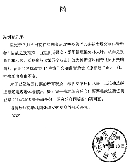 因演出档期调整,原定于7月4日(星期五)晚8:00在深圳音乐厅举办的《深圳交响乐团2013-14音乐季“贝多芬命运交响曲”音乐会》,演出日期调整至7月5日(星期六)晚8:00。