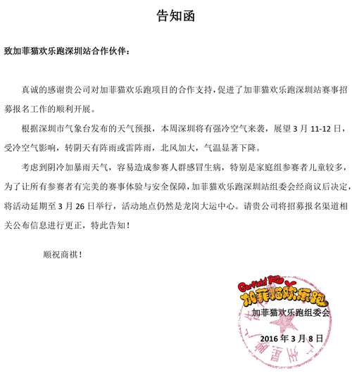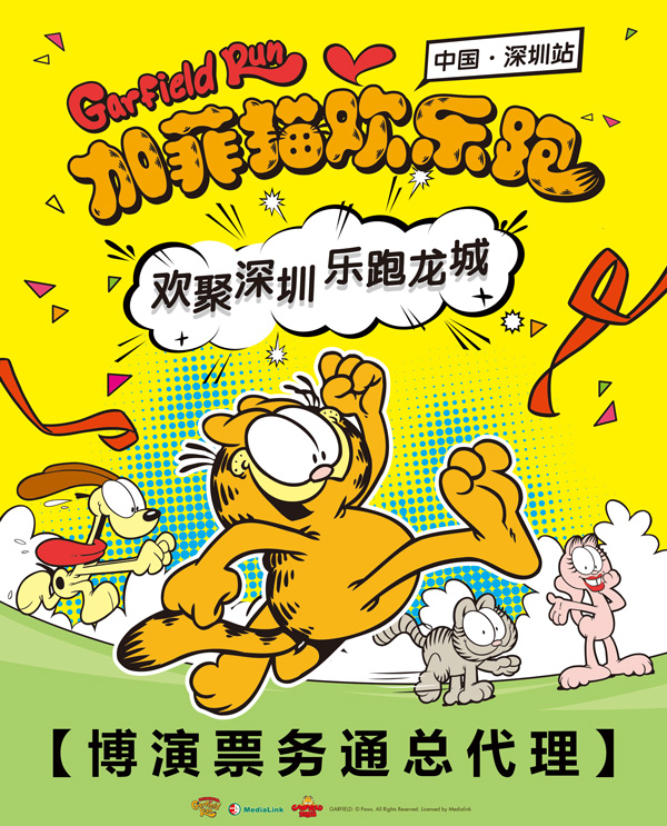 加菲猫欢乐跑深圳站是由深圳报业集团晶报社携手羚邦Medialink、星映传播、星图美道全力推动的大型全国品牌文化活动,将于2016年3月12日在深圳市龙岗大运中心鸣枪开跑。