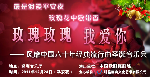 《玫瑰玫瑰我爱你——风靡中国六十年的情歌金曲专场音乐会》集合了流行于20世纪三四十年代上海流行曲中的精品,耗费巨资,全新策划、编曲和制作,配合现场乐队和灯光舞美,再现了20多首历经岁月而传唱不衰的经典的流行名曲,本场演出由我公司负责推广。