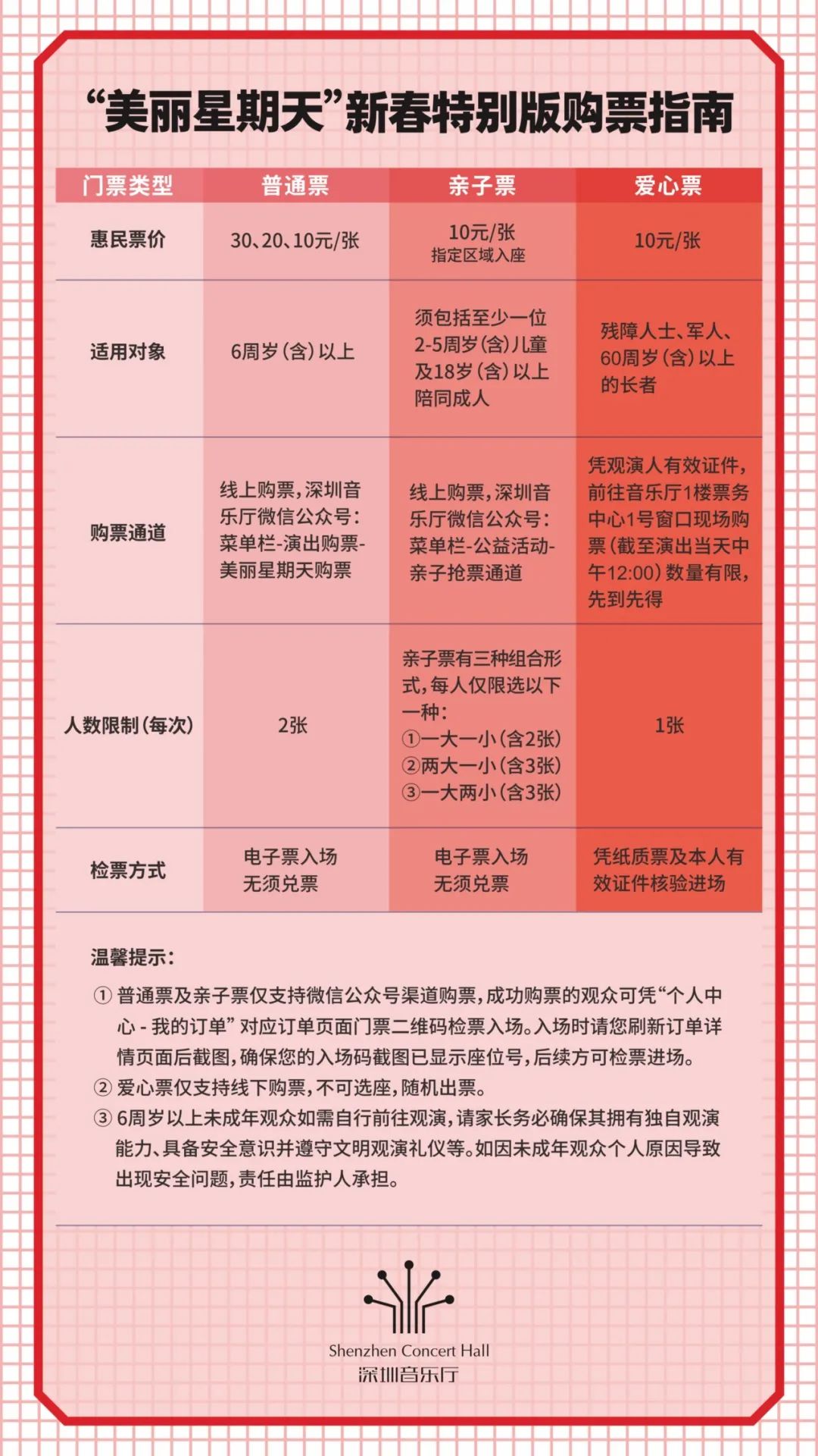 3、亲子票、爱心票预约细则详见《抢票指南》。演出当日中午12点剩余爱心票将放回票池。