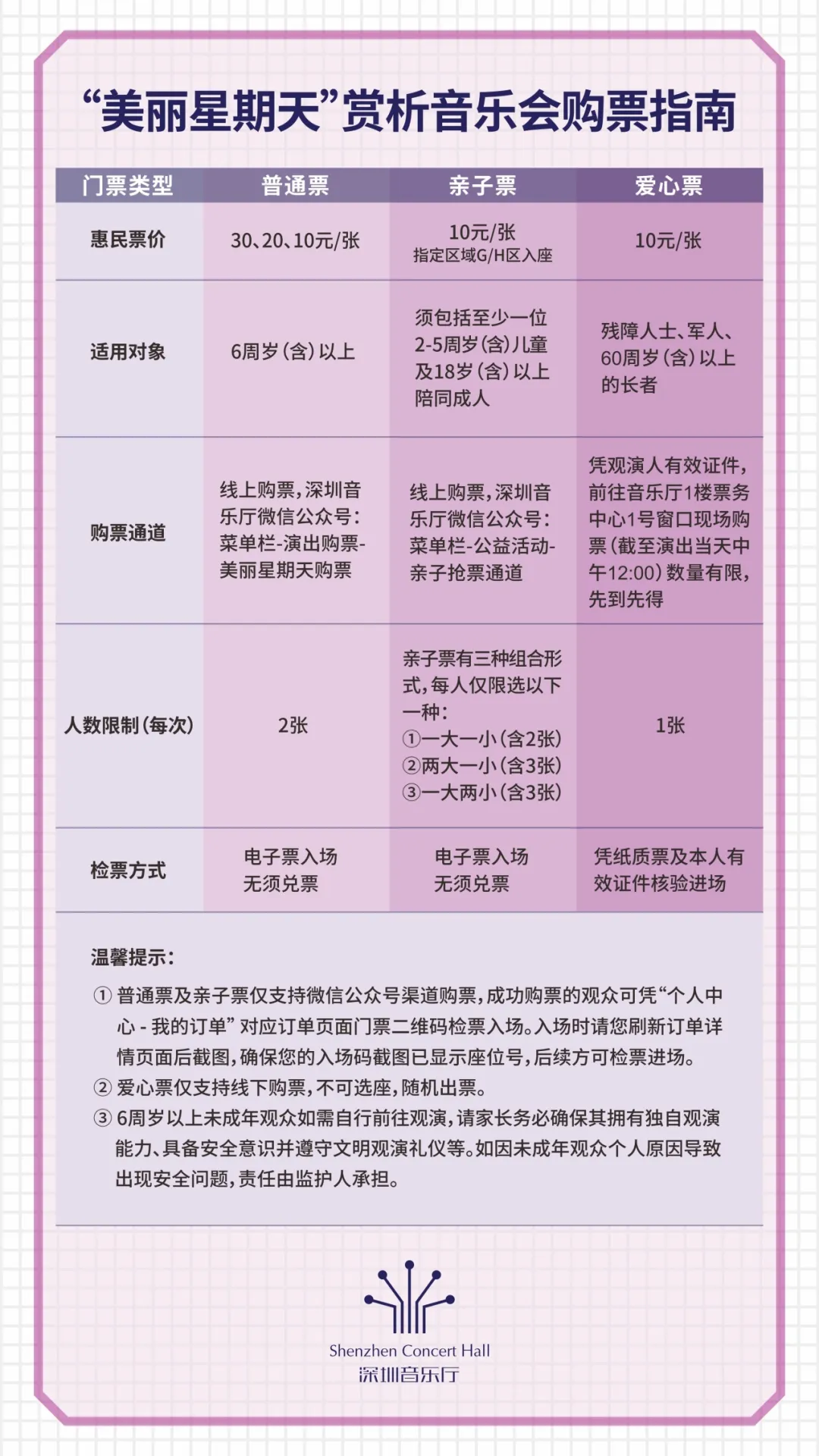 3、亲子票、爱心票预约细则详见《购票指南》。演出当日中午12点剩余爱心票将放回票池。